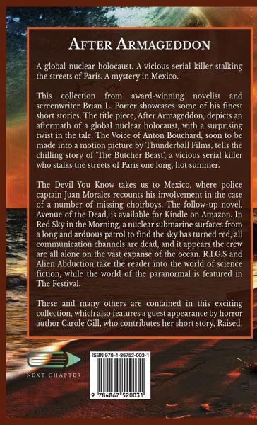 A global nuclear holocaust. A vicious serial killer stalking the streets of Paris. A mystery in Mexico. This collection from award-winning novelist and screenwriter Brian L. Porter showcases some of his finest short stories. The title piece, After Armageddon, depicts an aftermath of a global nuclear holocaust, with a surprising twist in the tale. The Voice of Anton Bouchard, soon to be made into a motion picture by Thunderball Films, tells the chilling story of 'The Butcher Beast', a vicious serial killer who stalks the streets of Paris one long, hot summer. The Devil You Know takes us to Mexico, where police captain Juan Morales recounts his involvement in the case of a number of missing choirboys. The follow-up novel, Avenue of the Dead, is available for Kindle on Amazon. In Red Sky in the Morning, a nuclear submarine surfaces from a long and arduous patrol to find the sky has turned red, all communication channels are dead, and it appears the crew are all alone on the vast expanse of the ocean. R.I.G.S and Alien Abduction take the reader into the world of science fiction, while the world of the paranormal is featured in The Festival. These and many others are contained in this exciting collection, which also features a guest appearance by horror author Carole Gill, who contributes her short story, Raised.