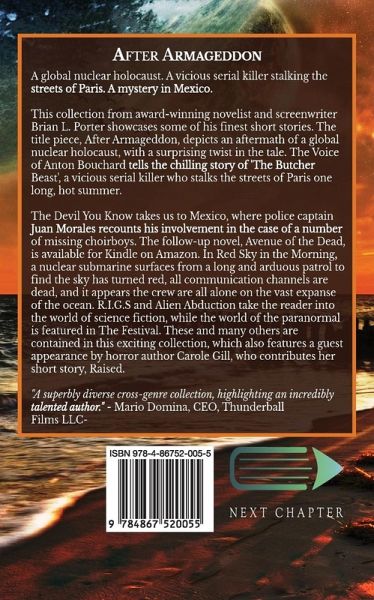 A global nuclear holocaust. A vicious serial killer stalking the streets of Paris. A mystery in Mexico. This collection from award-winning novelist and screenwriter Brian L. Porter showcases some of his finest short stories. The title piece, After Armageddon, depicts an aftermath of a global nuclear holocaust, with a surprising twist in the tale. The Voice of Anton Bouchard, soon to be made into a motion picture by Thunderball Films, tells the chilling story of 'The Butcher Beast', a vicious serial killer who stalks the streets of Paris one long, hot summer. The Devil You Know takes us to Mexico, where police captain Juan Morales recounts his involvement in the case of a number of missing choirboys. The follow-up novel, Avenue of the Dead, is available for Kindle on Amazon. In Red Sky in the Morning, a nuclear submarine surfaces from a long and arduous patrol to find the sky has turned red, all communication channels are dead, and it appears the crew are all alone on the vast expanse of the ocean. R.I.G.S and Alien Abduction take the reader into the world of science fiction, while the world of the paranormal is featured in The Festival. These and many others are contained in this exciting collection, which also features a guest appearance by horror author Carole Gill, who contributes her short story, Raised.