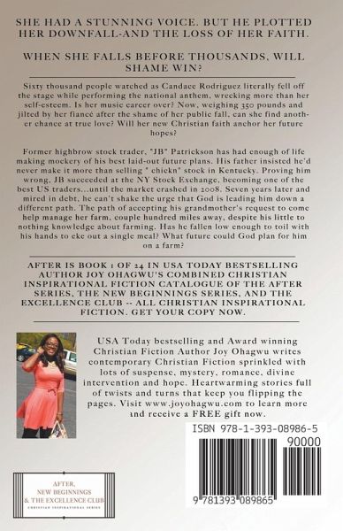 Christian Inspirational Fiction By an award winning USA Today bestselling author She had a stunning voice. But he plotted her downfall-and the loss of her faith. When she falls before thousands, will shame win? Sixty thousand people watched as Candace Rodriguez literally fell off the stage while performing the national anthem, wrecking more than her self-esteem. Is her music career over? Now, weighing 350 pounds and jilted by her fiancé after the shame of her public fall, can she find another chance at true love? Will her new Christian faith anchor her future hopes? Former highbrow stock trader, "JB" Patrickson has had enough of life making mockery of his best laid-out future plans. His father insisted he'd never make it more than selling " chickn" stock in Kentucky. Proving him wrong, JB succeeded at the NY Stock Exchange, becoming one of the best US traders...until the market crashed in 2008. Seven years later and mired in debt, he can't shake the urge that God is leading him down a different path. The path of accepting his grandmother's request to come help manage her farm, couple hundred miles away, despite his little to nothing knowledge about farming. Has he fallen low enough to toil with his hands to eke out a single meal? What future could God plan for him on a farm? Twenty years after returning to the US from a fulfilling medical mission in Asia, Dr. and Dr. Mrs. Cantwell gratefully send off two sons to college, purchase a flourishing twenty-acre farm, and prepare to settle into their empty nest stage. But what will they do if God leads one more life into their path, one needing stitches of the soul not of the body? Can they answer His call to service, or will overlooked pain from the past threaten the fragile peace they'd so desperately coaxed into existence to survive together? Find out how these lives intersect at the Day Spring Farms, and watch what God can do to turn brokenness and shattered dreams into masterpieces. AFTER, a Contemporary Christian Fiction Inspirational novel by award winning USA Today bestselling Author, Joy Ohagwu, is poised to spotlight the strength in transformation, courage in love and hope in times of despair. Get AFTER today!