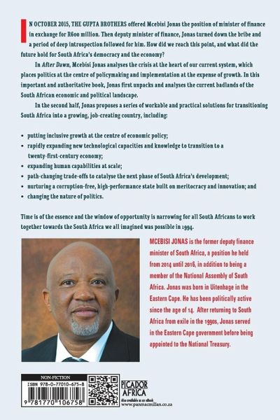 In October 2015, the Gupta brothers offered Mcebisi Jonas the position of minister of finance in exchange for R600 million. Then deputy minister of finance, Jonas turned down the bribe and a period of deep introspection followed for him. How did we reach this point, and what did the future hold for South Africa’s democracy and the economy? In After Dawn, Mcebisi Jonas analyses the crisis at the heart of our current system, which places politics at the centre of policymaking and implementation at the expense of growth. In this important and authoritative book, Jonas first unpacks and analyses the current badlands of the South African economic and political landscape. In the second half, Jonas proposes a series of workable and practical solutions for transitioning South Africa into a growing, job-creating country including: Putting inclusive growth at the centre of economic policy; rapidly expanding new technological capacities and knowledge to transition to a twenty-first-century economy; expanding human capabilities at scale; path-changing trade-offs to catalyse the next phase of South Africa’s development; nurturing a corruption-free, high-performance state built on meritocracy and innovation; and changing the nature of politics. Time is of the essence and the window of opportunity is narrowing for all South Africans to work together towards the South Africa we all imagined was possible in 1994.