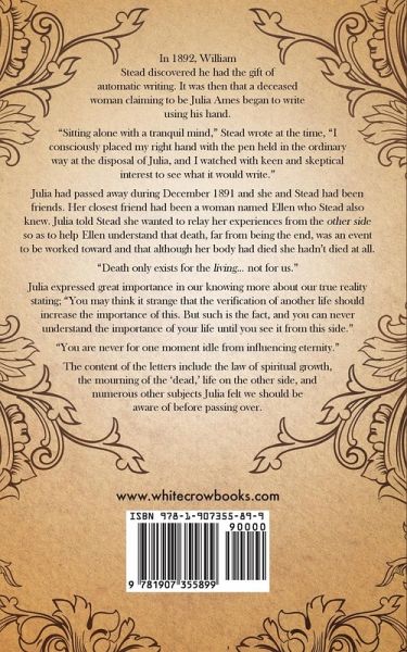 In 1892, William Stead discovered he had the gift of automatic writing and it was then that a discarnate entity claiming to be Julia Ames began to write using Stead's hand. "Sitting alone with a tranquil mind, I consciously placed my right hand, with the pen held in the ordinary way, at the disposal of Julia, and watched with keen and skeptical interest to see what it would write." Stead wrote at the time. Julia Ames was a professional journalist who also edited the The Woman's Union Signal of Chicago. Ames had passed away during December 1891 and she and Stead had been friends. Her closest friend was a woman named Ellen who Stead also knew. Julia told Stead she wanted to relay her experiences from the 'other side' so as to help Ellen understand that death, far from being the end, was an event to be worked toward and that although her body had died 'she' hadn't really died at all. Explaining the process of her death Julia wrote; "I did not feel any pain in "dying;" I felt only a great calm and peace. Then I awoke, and I was standing outside my old body, in the room. There was no one there at first, just myself and just myself. At first I wondered I was so strangely well. Then I saw that I had passed over. She added in another communication, "There is no death… Death is only a sense of deprivation and separation which the so-called living feel – an incident of limitation of ‘life.’ Death only exists for the ‘living,’ not for us." The letters were dictated during a period between 1892 and 1893 and during this time Julia asked Stead to set up a 'Bureau' — a sort of facility where, with the use of mediums, spiritual communications between the living and the spirit world could take place. Julia expressed great importance in our knowing more about our true reality stating; "you may think it strange that the verification of another life should increase the importance of this. But such is the fact, and you can never understand the importance of your life until you see it from this side. You are never, for one moment, idle from influencing eternity. You may think this a figure of speech. But it is not. You are, far more really than you imagine, making this world of ours in that world of yours." The content of the letters included the law of spiritual growth, the mourning of the 'dead', life on the other side, and numerous other subjects she felt those living in the physical should be aware of before passing over.