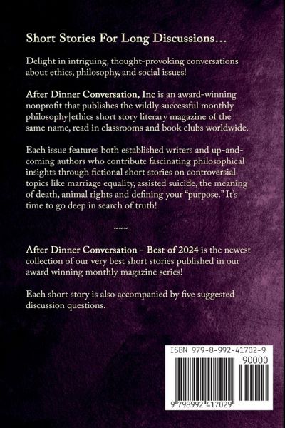 "Short Stories For Long Discussions..." Get ready to dive into the most thought-provoking and intellectually stimulating discussions of the year with "After Dinner Conversation - Best Of 2024." This must-have collection features the most compelling philosophy, ethics and social issues as short story fiction from one of the year's top-rated monthly literary magazines. With a diverse range of genres, from science-fiction to historical fiction, and with contributions from both established and up-and-coming authors, this book is guaranteed to challenge your beliefs and spark meaningful conversations! Perfect for philosophy students, fiction enthusiasts, or anyone looking to expand their mind; this book is a must-have for anyone who wants to take their conversations to the next level. Be the one to introduce your friends and family to the fascinating world of ethical and moral dilemmas. Each story comes with five suggested discussion questions that will keep you talking for hours. --------------------------- Short stories by: Adam Strassberg, Dawn Muenchrath, Julia Meinwald, C.M. Selbrede, Noelle Canty, C.S. Griffel, Taylor Lawritson, Scott Tierney, Fotis Banis, David Moore, Serena Smith, Joseph Lyttleton, Timothy Gaddo, Sam Franzini, Jack Whelan, Cassandra R. D'Alessandro, Patrick Hueller, Maura Morgan, Harley Carnell ¿¿¿ If you enjoy this anthology, subscribe via our website (print or digital) to "After Dinner Conversation Magazine" and receive similar ethical and philosophical short stories delivered every month. (Just search "After Dinner Conversation Magazine")¿¿¿