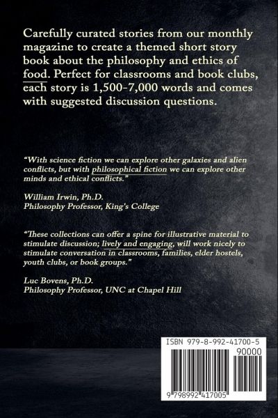 Named Top 10 "Best Lit Mags of 2023, 20024" by Chill Subs Carefully curated stories from After Dinner Conversation magazine to create a themed short story book about the philosophy and ethics of food. Perfect for classrooms and book clubs, each story is 1,500-7,000 words and comes with five suggested discussion questions. Edition Editor - Nicole Natale Story Summary ListMeat Is Meat: A starving ship, catches a mermaid and must decide what's for dinner. Observation 292: Science discovers plants feel pain like humans, and are sentient. The Walnut Tree: A travel tour in Uzbekistan gets sidetracked to wonderful effect. Intervention: Bill has decided it's time to confront his brother about his obesity. One Hour: A journalist interviews the owner of a strange restaurant and has a meal that causes him to question his life. Mayonnaise: The inventor of million dollar "zero fat, zero calorie" food additive discovers her invention is killing her son. Exodus: A Jewish family traveling through space to colonize a new world is woken by the AI so they can celebrate Passover. Apple Pi: A couple uses coin flips to make decisions in their relationship. I Do So, Like Durian: A sheltered teen on a quest through Chinatown finds a new world to explore. Reginald's Party: A female interloper crashes an "emotions" wine tasting. After Dinner Conversation believes humanity is improved by ethics and morals grounded in philosophical truth. Philosophical truth is discovered through intentional reflection and respectful debate. In order to facilitate that process, we have created a growing series of short stories across genres, a monthly magazine, themed books, and two podcasts. These accessible examples of abstract ethical and philosophical ideas are intended to draw out deeper discussions with friends, family, and students. Reviews 5/5 Stars! "With Science fiction we can explore other galaxies and alien conflicts, but with philosophical fiction we can explore other minds and ethical conflicts. Let this book take you on a Phi-Fi adventure." - William Irwin, Ph.D. - Philosophy Professor, King's College "After Dinner Conversation collections can offer a spine for such courses as illustrative material to stimulate discussion. Lively and engaging, perfect for classrooms and educational contexts, the stories stimulate conversation in families, elder hostels, youth clubs, or book groups." - Luc Bovens, Ph.D. - Philosophy Professor, University of North Carolina at Chapel Hill ¿¿¿ If you enjoy this story, subscribe via our website to "After Dinner Conversation Magazine" and get this, and other, similar ethical and philosophical short stories delivered straight to your inbox every month. (Just search "After Dinner Conversation Magazine")¿¿¿