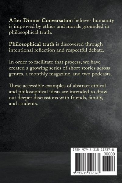 Delight in intriguing, thought-provoking conversations about ethics, philosophy, and social issues! After Dinner Conversation is a monthly literary magazine publishing short fiction. Each issue features both established writers and up-and-coming authors who contribute fascinating philosophical insights on controversial topics like marriage equality, assisted suicide, the meaning of death, animal rights and defining your "purpose." It's time to go deep in search of truth! If you love reading imaginative short stories on hot topics that make your brain think deeply but also have you laughing out loud... then this magazine is for you! "After Dinner Conversation" Magazine - February 2023M.I.N.D. Your Marriage: A newlywed realizes her husband has planted a memory reading device into her brain to "protect their marriage." The Causes of the First World War: A gay romance causes a downward spiral for one partner, and questions of ethics and responsibility for the other. Trick or Treat: A chance find at closing nik nak shop causes its buyer windfall profits. Jerry's World: Jerry has a wonderful life, and is pretty sure the world revolves around him. Momentary Paradise: The narrator watches a late-night movie that makes her question what moment in her life would be her personal framework for heaven. God is Alive: A would-be atheist philosopher has a personal interaction with God and is given a physics defying miracle of proof. In Their Image: A Pastor is invited to open a church on another planet, but finds its furry inhabitants have a unique faith all their own. After Dinner Conversation believes humanity is improved by ethics and morals grounded in philosophical truth. Philosophical truth is discovered through intentional reflection and respectful debate. In order to facilitate that process, we have created a growing series of short stories across genres, a monthly magazine, and two podcasts. These accessible examples of abstract ethical and philosophical ideas are intended to draw out deeper discussions with friends, family, and students. ¿¿¿ If you enjoy this story, subscribe via our website to "After Dinner Conversation Magazine" and get this, and other, similar ethical and philosophical short stories delivered straight to your inbox every month. (Just search "After Dinner Conversation Magazine")¿¿¿