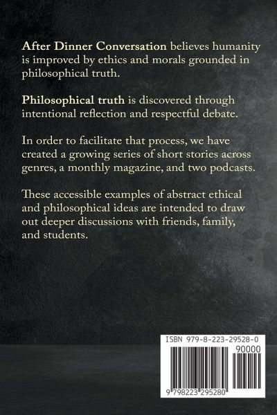 "After Dinner Conversation" Magazine - May 2022Dampening: Law enforcement from previously genocidal enemies are forced to work together to solve a possible murder. The Big, Immovable I: Daphne is institutionalized while trying to answer the question, "Why am I, I?" The Man Who Killed The Dog: A man slowly goes crazy because he is unable to come to terms with his past. Hollywood Baby: A little girl is "born" by a film studio, and is raised as their ward. Help Wanted. Really?: Algorithms judge our resumes, so why not Bot the Bot? On Good Authority: A doctor with a new vaccine for the "zombie virus" takes it to the next town and discovers two startling revelations. All My Tomorrows: A down on his luck man in his twilight comes into a "memory storage facility" to trade his remaining days for the chance to re-experience his "last good day." After Dinner Conversation believes humanity is improved by ethics and morals grounded in philosophical truth. Philosophical truth is discovered through intentional reflection and respectful debate. In order to facilitate that process, we have created a growing series of short stories, audio and video podcast discussions, across genres, as accessible examples of abstract ethical and philosophical ideas intended to draw out deeper discussions with friends and family. ¿¿¿ If you enjoy this story, subscribe via our website to "After Dinner Conversation Magazine" and get this, and other, similar ethical and philosophical short stories delivered straight to your inbox every month. (Just search "After Dinner Conversation Magazine")¿¿