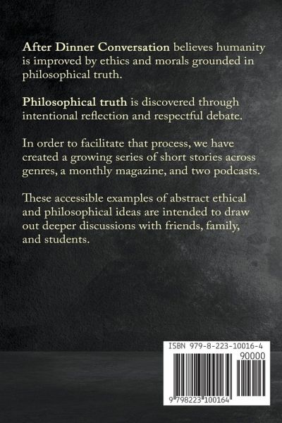 "After Dinner Conversation" Magazine - March 2022Now You Know: Felons virtually live their victims criminal experience, and the ramifications of the crime. The Tomorrow Man: A young man claims he is able to "remember" the future. The Glowing Bonsai And The Kintsugi Pot: A penitant man attempts to stop the NSA from weaponizing his programmable light emitting plants. Hedonics, Inc: A corporation has cracked the code to making everyone completely happy, all of the time. Soul Reader: A dying cancer patient is given the "gift" of experiencing the emotions of those around him. Two-Percenters: A new treatment may allow 98% of the people to be genetically enhanced, but at the expense of the 2% who already are. Venom In The Cloud Forest: A young man suspects someone has been changing past tribal records. After Dinner Conversation believes humanity is improved by ethics and morals grounded in philosophical truth. Philosophical truth is discovered through intentional reflection and respectful debate. In order to facilitate that process, we have created a growing series of short stories, audio and video podcast discussions, across genres, as accessible examples of abstract ethical and philosophical ideas intended to draw out deeper discussions with friends and family. ¿¿¿ If you enjoy this story, subscribe via our website to "After Dinner Conversation Magazine" and get this, and other, similar ethical and philosophical short stories delivered straight to your inbox every month. (Just search "After Dinner Conversation Magazine")¿¿