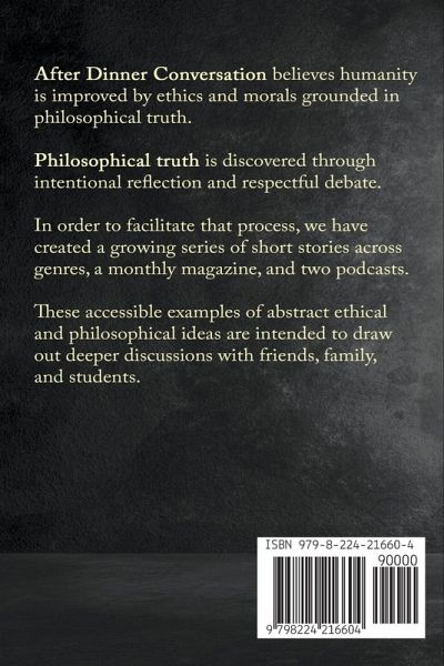 Named Top 10 "Best Lit Mags of 2023" by Chill Subs Delight in intriguing, thought-provoking conversations about ethics, philosophy, and social issues! After Dinner Conversation is a monthly literary magazine publishing short fiction. Each issue features both established writers and up-and-coming authors who contribute fascinating philosophical insights on controversial topics like marriage equality, assisted suicide, the meaning of death, animal rights and defining your "purpose." It's time to go deep in search of truth! If you love reading imaginative short stories on hot topics that make your brain think deeply but also have you laughing out loud... then this magazine is for you! "After Dinner Conversation" Magazine - June 2024 Going Through the Motions: A self-help devotee starts his own school. Today is a Day Like Any Other: A small-time suburban thief enters a house to find a man waiting to die. The Bathroom: An elderly man becomes focused on the youthful woman next door that offers a glimpse in a life long past. Uncle Jed's War: An aged Uncle Jed becomes a trouble-maker in his small town against tract home development. The Z Prize: A woman discovers her baby may be the key to stopping Alzheimer's disease. Miscommunication: Stuck in a house they can't sell, the owners hatch a plan. Grandma Ruth's UP Truck Stop: Rachel is called back to her small town when she is informed her Uncle Stewart has passed away and learns the town has a disturbing secret. After Dinner Conversation believes humanity is improved by ethics and morals grounded in philosophical truth. Philosophical truth is discovered through intentional reflection and respectful debate. In order to facilitate that process, we have created a growing series of short stories across genres, a monthly magazine, and two podcasts. These accessible examples of abstract ethical and philosophical ideas are intended to draw out deeper discussions with friends, family, and students. ¿¿¿ If you enjoy this story, subscribe via our website to "After Dinner Conversation Magazine" and get this, and other, similar ethical and philosophical short stories delivered straight to your inbox every month. (Just search "After Dinner Conversation Magazine")¿¿