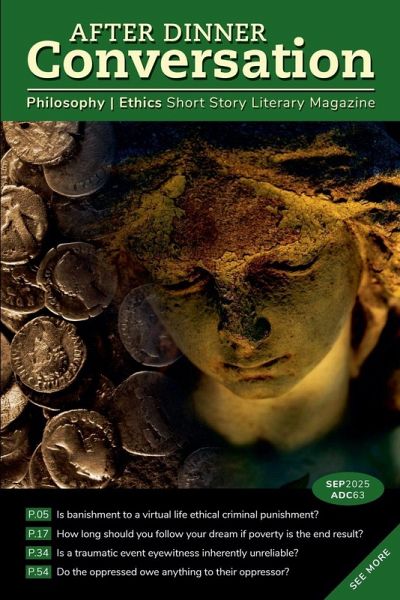 Rated "Most Popular Fiction Magazine 2024" by Chill Subs Named Top 10 "Best Lit Mags of 2023, 2024" by Chill Subs Rated "Top 50 Fiction" by Substack Delight in intriguing, thought-provoking conversations about ethics, philosophy, and social issues! After Dinner Conversation is a monthly literary magazine publishing short fiction. Each issue features both established writers and up-and-coming authors who contribute fascinating philosophical insights on controversial topics like marriage equality, assisted suicide, the meaning of death, animal rights and defining your "purpose." It's time to go deep in search of truth! If you love reading imaginative short stories on hot topics that make your brain think deeply but also have you laughing out loud... then this magazine is for you! "After Dinner Conversation" Magazine - September 2025Verisimilitude: Gemma grapples with the transfer of her brother into a permanent simulated reality as punishment for his crimes. Two-Hander: A struggling actor grapples with career aspirations and the pressures of a materialistic society. The Third Driver: The narrator witnesses a deadly car crash and struggles with his own memory and potential culpability. Beyond the Esquiline Gate: A resourceful slave in ancient Rome, seeks to earn enough money to buy freedom for himself and his sister. At Age Four: A new drug that promises to align transgender individuals' sexual identity with their birth sex. Changelings: Maternal love falters when newborn Leo is replaced with another baby due to a hospital mix-up. Conscience Cleaners: A lawyer argues that his criminal client's profound and genuine repentance has rendered the painful memories a form of cruel and unusual punishment. After Dinner Conversation is an award-winning independent nonprofit publisher. We believe in fostering meaningful discussions among friends, family, and students to enhance humanity through truth-seeking, reflection, and respectful debate. To achieve this, we publish philosophical and ethical short story fiction accompanied by discussion questions. ¿¿¿ If you enjoy this story, subscribe via our website to "After Dinner Conversation Magazine" and get this, and other, similar ethical and philosophical short stories delivered straight to your inbox every month. (Just search "After Dinner Conversation Magazine")¿¿