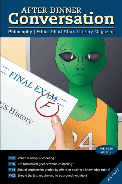 Rated "Most Popular Fiction Magazine 2024" by Chill Subs Named Top 10 "Best Lit Mags of 2023, 2024" by Chill Subs Rated "Top 50 Fiction" by Substack Delight in intriguing, thought-provoking conversations about ethics, philosophy, and social issues! After Dinner Conversation is a monthly literary magazine publishing short fiction. Each issue features both established writers and up-and-coming authors who contribute fascinating philosophical insights on controversial topics like marriage equality, assisted suicide, the meaning of death, animal rights and defining your "purpose." It's time to go deep in search of truth! If you love reading imaginative short stories on hot topics that make your brain think deeply but also have you laughing out loud... then this magazine is for you! "After Dinner Conversation" Magazine - January 2026hi Profesor Grade Late assignment thanks: A college professor confronts a student whose perfect essays exposes AI use in education. The Work of the Walk: A woman joins a ritualized grief pilgrimage after the death of a loved one. The Visitors' Ark: Extraterrestrial "Visitors" reshape academia when they join the college basketball team. The Recluse at Number One: A neighbor is put on trial for going on vacation. The Games: Prisoners make money and shorten their sentences by participating in violent televised games. Pollice Verso: In a world obsessed with judgment and spectacle, everyone votes, but only one randomly selected vote decides. Bugs in the Valley: Scientists create life-extending "bugs" but must confront who should get treatment first. After Dinner Conversation is an award-winning independent nonprofit publisher. We believe in fostering meaningful discussions among friends, family, and students to enhance humanity through truth-seeking, reflection, and respectful debate. To achieve this, we publish philosophical and ethical short story fiction accompanied by discussion questions. If you enjoy this story, subscribe via our website to "After Dinner Conversation Magazine" and get this, and other, similar ethical and philosophical short stories delivered straight to your inbox every month. (Just search "After Dinner Conversation Magazine")