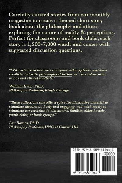 Named Top 10 "Best Lit Mags of 2023" by Chill Subs Carefully curated stories from After Dinner Conversation magazine to create a themed short story book about the philosophy and ethics exploring the nature of reality and perceptions. Perfect for classrooms and book clubs, each story is 1,500-7,000 words and comes with five suggested discussion questions. Story Summary ListHome For The Holidays: A son comes home for the holidays to find his parents have shrunk to two feet tall. Abrama's End Game: Abrama learns the gods created her dimension as their play-space to visit, and is forced to fight across realities when she discovers their plan to shut it down. Rose-tinted Glasses: Two children race to get glasses that allow adults to see the magical world around them to the Fairytale Fellowship before it's too late. The Big, Immovable I: Daphne is institutionalized while trying to answer the question, "Why am I, I?" Sort of Polarity: A new disease hits the earth that causes very selective blindness in humanity. The Angel In The Juniper: Holly meets an angel who tells her to kill her revolutionary professor. Seconds Last: A man enjoys an infinite number of perfect days in the park with his friend. Acceptance: A man sinking in mud refuses help. Glad All Over: An elderly man helps his fellow season-ticket holder with his existential crisis with philosophy lessons. I Do So, Like Durian: A sheltered teen on a quest through Chinatown finds a new world to explore. After Dinner Conversation believes humanity is improved by ethics and morals grounded in philosophical truth. Philosophical truth is discovered through intentional reflection and respectful debate. In order to facilitate that process, we have created a growing series of short stories across genres, a monthly magazine, themed books, and two podcasts. These accessible examples of abstract ethical and philosophical ideas are intended to draw out deeper discussions with friends, family, and students. Reviews 5/5 Stars! "With Science fiction we can explore other galaxies and alien conflicts, but with philosophical fiction we can explore other minds and ethical conflicts. Let this book take you on a Phi-Fi adventure." - William Irwin, Ph.D. - Philosophy Professor, King's College "After Dinner Conversation has taken up the initiative to write themed collections of short stories that fit focused ethics courses - say, a course on bioethics, AI ethics, Tech ethics etc. These collections can offer a spine for such courses or individual stories could be added to a course as illustrative material to stimulate discussion. The stories are lively and engaging and followed by a set of questions to start classroom discussion. Also, outside of educational contexts, the stories will work nicely to stimulate conversation in families, elder hostels, youth clubs, or book groups. Give it a try - I trust that you will enjoy working with the material in this book!" - Luc Bovens, Ph.D. - Philosophy Professor, University of North Carolina at Chapel Hill ¿¿¿ If you enjoy this story, subscribe via our website to "After Dinner Conversation Magazine" and get this, and other, similar ethical and philosophical short stories delivered straight to your inbox every month. (Just search "After Dinner Conversation Magazine")¿¿