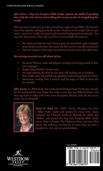 After Easter-Step into Scripture Bible Study, captures the thrill of spending time with the risen Savior and tackling the enormous job of evangelizing the world! This interactive study lets you insert yourself into pages of your Bible. You become one of the apostles, taking part in the action. Scripture is the script! Like an epic movie, scenes are vividly presented and historical background introduced. You step into those scenes. How will you feel as events unfold? For instance: Just when you think the risen Christ is gone, he comes back, again and again! Jesus teaches you for forty days until one afternoon he ascends into heaven! Now the religious rulers target you and your friends as they once did Christ. But exciting moments are still ahead of you: Pentecost! Flames, wind, and pilgrims hearing God being praised in their own language! People being healed in Jesus's name. An angel opening the door in your dark cell, leading you to freedom. Peter, bolder than ever confronting opposition and winning hearts for Christ. Samaritans, turning from a sorcerer and his magic to faith in Jesus and his miracles! After Easter, is a Bible Study that marks powerful beginnings for the new church, for the world and for you. Enjoy this study as you step into Biblical history and then step back to today with a new sense of purpose. Because, after all, the acts of Christ are not finished!