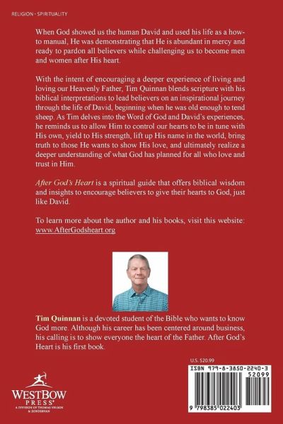 When God showed us the human David and used his life as a howto manual, He was demonstrating that He is abundant in mercy and ready to pardon all believers while challenging us to become men and women after His heart. With the intent of encouraging a deeper experience of living and loving our Heavenly Father, Tim Quinnan blends scripture with his biblical interpretations to lead believers on an inspirational journey through the life of David, beginning when he was old enough to tend sheep. As Tim delves into the Word of God and David's experiences, he reminds us to allow Him to control our hearts to be in tune with His own, yield to His strength, lift up His name in the world, bring truth to those He wants to show His love, and ultimately realize a deeper understanding of what God has planned for all who love and trust in Him. After God's Heart is a spiritual guide that offers biblical wisdom and insights to encourage believers to give their hearts to God, just like David. To learn more about the author and his books, visit this website: www.AfterGodsheart.org