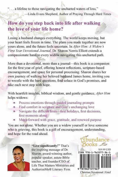 How do you move forward when the love of your life is no longer by your side? Losing a husband is more than grief-it's an upheaval of everything you knew and expected. In After Him: A Widow's First Year Devotional Journal, Dr. Sharon Norris Elliott invites widows to journey with her through the first year of loss, offering a compassionate, faith-filled companion for the road ahead. Part devotional, part journal, and part memoir, this heartfelt book provides honest reflections, guided scripture-based encouragement, and space for personal processing. Through candid storytelling and biblical wisdom, Sharon shares how she walked her beloved husband James home to heaven-and how God walked her back into life. Inside, you'll find: ¿ Encouraging devotionals to help navigate grief and healing ¿ Journaling prompts for reflection and personal growth ¿ Biblical truths to bring comfort and hope ¿ A compassionate voice that understands the challenges of widowhood Whether you are a new widow or further along in your journey, After Him is a gentle guide to rediscovering hope, faith, and the strength to embrace your new normal. You are not alone. God is with you-every step of the way.