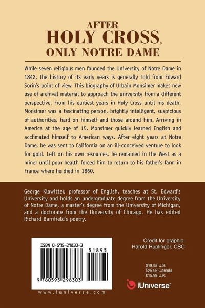 While seven religious men founded the University of Notre Dame in 1842, the history of its early years is generally told from Edward Sorin's point of view. This biography of Urbain Monsimer makes new use of archival material to approach the university from a different perspective. From his earliest years in Holy Cross until his death, Monsimer was a fascinating person, brightly intelligent, suspicious of authorities, hard on himself and those around him. Arriving in America at the age of 15, Monsimer quickly learned English and acclimated himself to American ways. After eight years at Notre Dame, he was sent to California on an ill-conceived venture to look for gold. Left on his own resources, he remained in the West as a miner until poor health forced him to return to his father's farm in France where he died in 1860.