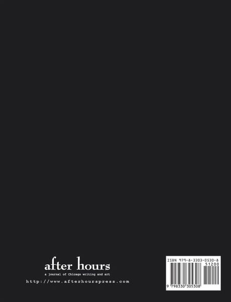 After Hours, a journal of Chicago writing and art, since June 2000. A bi-annual literary journal, this is issue #48 Summer 2024 with featured writer Brenda Cardenas plus winners of the 6th Annual Mary Blinn Poetry Prize. Past issues of After Hours have included Mark Turcotte, Stuart Dybek, Diane DiPrima, Norbert Blei, Billy Lombardo, Rane Arroyo, Albert DeGenova, Marty McConnell, David Hernandez, Herb Nolan, Nina Corwin, Jacob Saenz, Haki R. Madhubuti, and many more writers and artists who call (or have called) Chicago home. www.afterhourspress.com