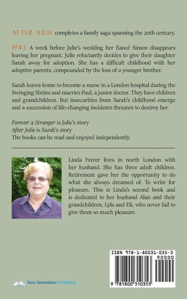 After Julie completes a family saga spanning the 20th century. 1941. A week before Julie's wedding her fiancé Simon disappears leaving her pregnant. Julie reluctantly decides to give their daughter Sarah away for adoption. She has a difficult childhood with her adoptive parents, compounded by the loss of a younger brother. Sarah leaves home to become a nurse in a London hospital during the Swinging Sixties and marries Paul, a junior doctor. They have children and grandchildren. But insecurities from Sarah's childhood emerge and a succession of life-changing incidents threaten to destroy her. Forever a Stranger is Julie's story After Julie is Sarah's story The books can be read and enjoyed independently. Linda Ferrer lives in north London with her husband. She has three adult children. Retirement gave her the opportunity to do what she always dreamed of. To write for pleasure. This is Linda's second book and is dedicated to her husband Alan and their grandchildren, Lyla and Eli, who never fail to give them so much pleasure.