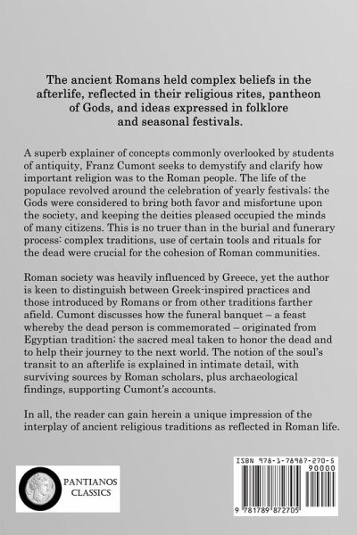 The ancient Romans held complex beliefs in the afterlife, reflected in their religious rites, pantheon of Gods, and ideas expressed in folklore and seasonal festivals. A superb explainer of concepts commonly overlooked by students of antiquity, Franz Cumont seeks to demystify and clarify how important religion was to the Roman people. The life of the populace revolved around the celebration of yearly festivals; the Gods were considered to bring both favor and misfortune upon the society, and keeping the deities pleased occupied the minds of many citizens. This is no truer than in the burial and funerary process: complex traditions, use of certain tools and rituals for the dead were crucial for the cohesion of Roman communities. Roman society was heavily influenced by Greece, yet the author is keen to distinguish between Greek-inspired practices and those introduced by Romans or from other traditions farther afield. Cumont discusses how the funeral banquet - a feast whereby the dead person is commemorated - originated from Egyptian tradition; the sacred meal taken to honor the dead and to help their journey to the next world. The notion of the soul's transit to an afterlife is explained in intimate detail, with surviving sources by Roman scholars, plus archaeological findings, supporting Cumont's accounts. In all, the reader can gain herein a unique impression of the interplay of ancient religious traditions as reflected in Roman life.