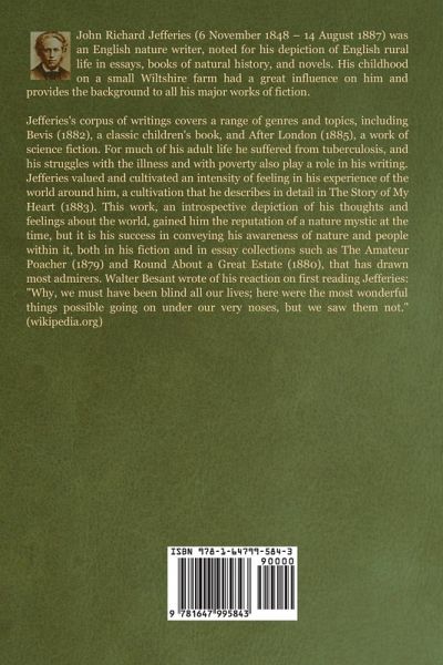 John Richard Jefferies (6 November 1848 - 14 August 1887) was an English nature writer, noted for his depiction of English rural life in essays, books of natural history, and novels. His childhood on a small Wiltshire farm had a great influence on him and provides the background to all his major works of fiction. Jefferies's corpus of writings covers a range of genres and topics, including Bevis (1882), a classic children's book, and After London (1885), a work of science fiction. For much of his adult life he suffered from tuberculosis, and his struggles with the illness and with poverty also play a role in his writing. Jefferies valued and cultivated an intensity of feeling in his experience of the world around him, a cultivation that he describes in detail in The Story of My Heart (1883). This work, an introspective depiction of his thoughts and feelings about the world, gained him the reputation of a nature mystic at the time, but it is his success in conveying his awareness of nature and people within it, both in his fiction and in essay collections such as The Amateur Poacher (1879) and Round About a Great Estate (1880), that has drawn most admirers. Walter Besant wrote of his reaction on first reading Jefferies: "Why, we must have been blind all our lives; here were the most wonderful things possible going on under our very noses, but we saw them not.