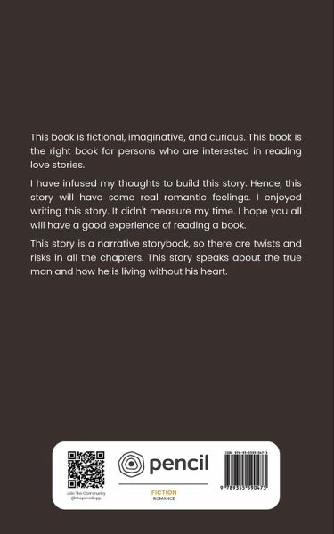 This book is fictional, imaginative, and curious. This book is the right book for persons who are interested in reading love stories. I have infused my thoughts to build this story. Hence, this story will have some real romantic feelings. I enjoyed writing this story. It didn't measure my time. I hope you all will have a good experience of reading a book. This story is a narrative storybook, so there are twists and risks in all the chapters. This story speaks about the true man and how he is living without his heart.