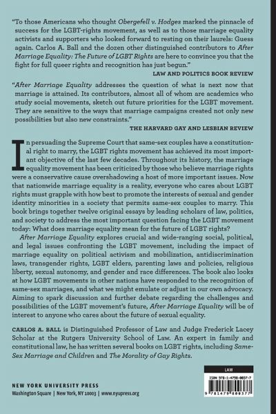 Examines the impact of marriage equality on the future of LGBT rights In persuading the Supreme Court that same-sex couples have a constitutional right to marry, the LGBT rights movement has achieved its most important objective of the last few decades. Throughout its history, the marriage equality movement has been criticized by those who believe marriage rights were a conservative cause overshadowing a host of more important issues. Now that nationwide marriage equality is a reality, everyone who cares about LGBT rights must grapple with how best to promote the interests of sexual and gender identity minorities in a society that permits same-sex couples to marry. This book brings together 12 original essays by leading scholars of law, politics, and society to address the most important question facing the LGBT movement today: What does marriage equality mean for the future of LGBT rights? After Marriage Equality explores crucial and wide-ranging social, political, and legal issues confronting the LGBT movement, including the impact of marriage equality on political activism and mobilization, antidiscrimination laws, transgender rights, LGBT elders, parenting laws and policies, religious liberty, sexual autonomy, and gender and race differences. The book also looks at how LGBT movements in other nations have responded to the recognition of same-sex marriages, and what we might emulate or adjust in our own advocacy. Aiming to spark discussion and further debate regarding the challenges and possibilities of the LGBT movement's future, After Marriage Equality will be of interest to anyone who cares about the future of sexual equality.