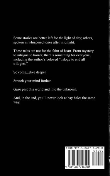 Some stories are better left for the light of day; others, spoken in whispered tones after midnight. These tales are not for the faint of heart. From mystery to intrigue to horror, there's something for everyone, including the author's beloved "trilogy to end all trilogies." So come...dive deeper. Stretch your mind further. Gaze past this world and into the unknown. And you'll never look at hay bales the same way.