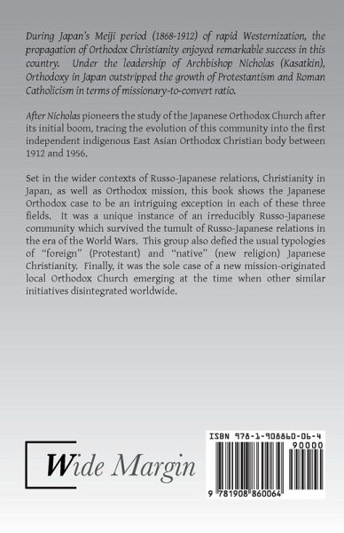 During Japan's Meiji period (1868-1912) of rapid Westernization, the propagation of Orthodox Christianity enjoyed remarkable success in this country. Under the leadership of Archbishop Nicholas (Kasatkin), Orthodoxy in Japan outstripped the growth of Protestantism and Roman Catholicism in terms of missionary-to-convert ratio. After Nicholas pioneers the study of the Japanese Orthodox Church after its initial boom, tracing the evolution of this community into the first independent indigenous East Asian Orthodox Christian body between 1912 and 1956. Set in the wider contexts of Russo-Japanese relations, Christianity in Japan, as well as Orthodox mission, this book shows the Japanese Orthodox case to be an intriguing exception in each of these three fields. It was a unique instance of an irreducibly Russo-Japanese community which survived the tumult of Russo-Japanese relations in the era of the World Wars. This group also defied the usual typologies of "foreign" (Protestant) and "native" (new religion) Japanese Christianity. Finally, it was the sole case of a new mission-originated local Orthodox Church emerging at the time when other similar initiatives disintegrated worldwide.