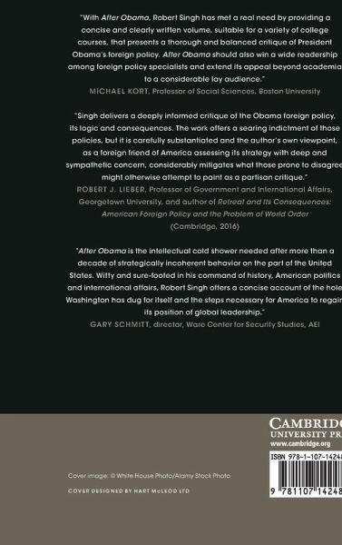 Barack Obama's foreign policy has failed but the American strategic mind has not yet closed. In After Obama, Robert Singh examines how and why US influence has weakened and contributed to the erosion of the world America made, endangering international order and liberal values. A well-intentioned but naive strategy of engagement has encouraged US adversaries such as Russia, China and Iran to assert themselves while allowing Western alliances to fray. But, challenging claims of an inevitable American decline, Singh argues that US leadership is a matter of will as much as wallet. Despite partisan polarization at home and the rise of the rest abroad, Washington can renew American leadership and, through a New American Internationalism, pave a path to the restoration of global order. Timely and provocative, the book offers a powerful critique of the Obama Doctrine and a call for strategic resolution in place of 'leading from behind'.