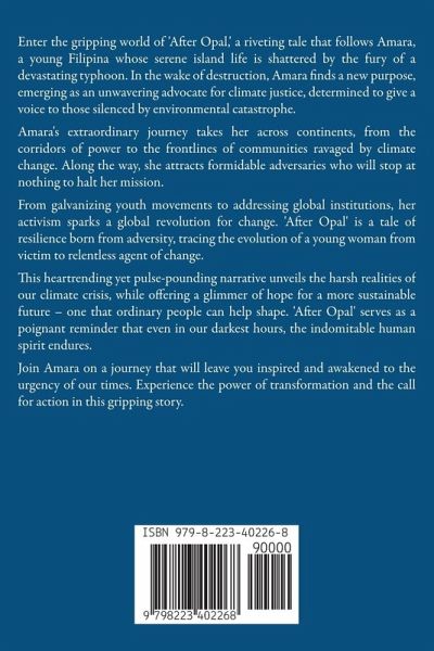 Enter the gripping world of 'After Opal,' a riveting tale that follows Amara, a young Filipina whose serene island life is shattered by the fury of a devastating typhoon. In the wake of destruction, Amara finds a new purpose, emerging as an unwavering advocate for climate justice, determined to give a voice to those silenced by environmental catastrophe. Amara's extraordinary journey takes her across continents, from the corridors of power to the frontlines of communities ravaged by climate change. Along the way, she attracts formidable adversaries who will stop at nothing to halt her mission. From galvanizing youth movements to addressing global institutions, her activism sparks a global revolution for change. 'After Opal' is a tale of resilience born from adversity, tracing the evolution of a young woman from victim to relentless agent of change. This heartrending yet pulse-pounding narrative unveils the harsh realities of our climate crisis, while offering a glimmer of hope for a more sustainable future – one that ordinary people can help shape. 'After Opal' serves as a poignant reminder that even in our darkest hours, the indomitable human spirit endures. Join Amara on a journey that will leave you inspired and awakened to the urgency of our times. Experience the power of transformation and the call for action in this gripping story.