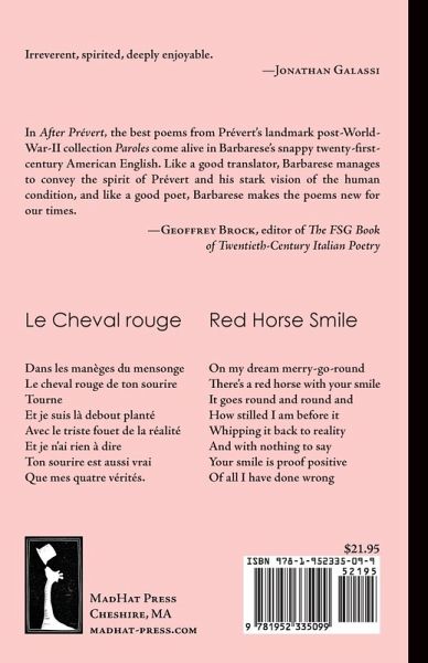 In After Pre¿vert, the best poems from Pre¿vert's landmark post-World- War-II collection Paroles come alive in Barbarese's snappy twenty-first-century American English. Like a good translator, Barbarese manages to convey the spirit of Prévert and his stark vision of the human condition, and like a good poet, Barbarese makes the poems new for our times. -Geoffrey Brock, editor of The FSG Book of Twentieth-Century Italian Poetry