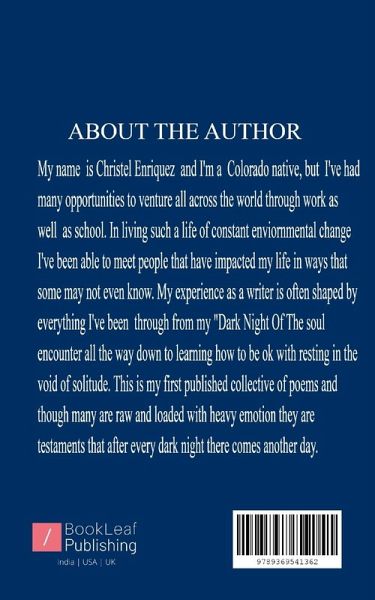 Dear Reader, It would do me no good to say that in writing this collective I came to a final destination that revealed all the answers to some of life's most difficult questions. In fact in most of these poems, you will find depictions of a wandering soul trying to find their way back home, and in doing so I've found that my actions coupled with the people I've met thus far during this journey have continuously broadened my perspective on what it truly is to be alive. That being said, I invite you to come with me as I navigate through the voids and search for light at the end of every storm.