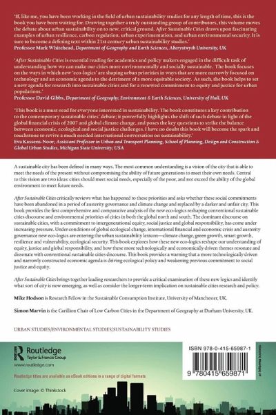 After Sustainable Cities provides the reader with the first comprehensive, critical and comparative analysis of the new eco-logics reshaping conventional sustainable cities discourse. It brings together leading researchers on smart cities, green growth, resource flows, vulnerability and resilience, ecological security and climate change who critically examine how these new eco-logics are reshaping the environmental priorities of cities in both the global north and south. Each chapter carefully considers what these new logics do to the original precepts of sustainable cities and identify what sort of city is now emerging. After Sustainable Cities provides a warning that a much darker more technologically driven and narrowly constructed economic agenda is driving ecological policy and weakening previous commitment to social justice and equity.