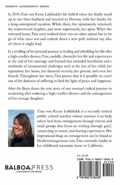 In 2010, Tina von Reese Lokkbakk's life shifted when she finally stood up to her then husband and traveled to Norway with her family for a long-anticipated vacation. While there, her spontaneity returned, she rediscovered laughter, and most importantly, her spirit. When she returned home, Tina soon realized there was no other option but to let go of what once was and embark down a new path without any idea of where it might lead. In a retelling of her personal journey to healing and rebuilding her life after a high-conflict divorce, Tina candidly chronicles her life and experiences at the end of her marriage and beyond that included heartbreak and a multitude of monumental challenges such as the loss of her child, her reputation, her home, her financial security, her parents, and even her friends. Throughout her story, Tina proves that it is possible to crawl out of the darkness of suffering to find the light of peace and happiness. After the Burn shares the true story of one woman's radical journey to awakening after enduring a high-conflict divorce and the estrangement of her teenage daughter.