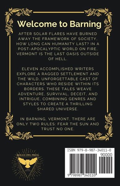 After solar flares have burned away the framework of society, how long can humanity last? In a post-apocalyptic world on fire, a patchwork settlement in Vermont is the last oasis outside of hell. Eleven writers explore this ragged setting and the wild, unforgettable cast of characters who reside within its borders, weaving tales of adventure, survival, deceit, and intrigue that combine genres and styles to create a thrilling shared universe. Welcome to Barning, Vermont, where there are only two rules: fear the sun and trust no one.
