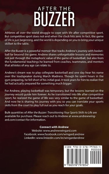 A perfect gift for graduates! Athletes all over the world struggle to cope with life after competitive sport. But competitive sport does not end when the clock hits zero. In fact, the game of life is just beginning, and the world is depending on you to bring your unique skillset to the table. After the Buzzer is a powerful memoir that tracks Andrew's journey with basketball far beyond the game. Andrew shares unforgettable lessons and memories not just through the metaphoric value of the game of basketball, but also from the fundamental teachings he learned from coaches, teammates, and mentors that athletes of any age can relate to. Andrew's dream was to play collegiate basketball and one day hear his name over the loudspeaker during March Madness. Though he spent hours in the gym preparing, he fell short of his initial goal. It took years for him to realize that he had actually prepared for something much bigger. For Andrew, playing basketball was temporary, but the lessons learned on the journey would guide him forever. As he transitioned into life after competitive sport, he realized the game of life was very similar to the game of basketball. And now he is sharing his journey with you so you can translate your sports skills from the court or field to play full out as you reach for your goals. Bulk quantities of After the Buzzer: Transitioning Your Sports Skills to Life are available for purchase. Please reach out to Andrew at www.andrewwingard.com/contact for information. Connect with Andrew Website: www.andrewwingard.com Facebook: www.facebook.com/wingard.andrew LinkedIn: www.linkedin.com/in/wingardandrew