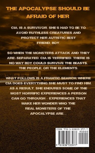 They are separated in the apocalypse, and she knows he will not survive. Can she get back to him before the monsters do? Or will they be lost from each other forever?Cia, a young woman in the apocalypse, is a survivor. She's had to be to avoid the ruthless creatures and protect her autistic best friend, Boy.So when the monsters attack and they are separated, Cia is terrified. There is no way Boy could survive the beasts, the people, or the elements.What follows is a frantic search, where Cia does everything she must to find him. As a result, she endures some of the most horrific experiences a person can go through - experiences that make her wonder who the real monsters of the apocalypse are...Can she survive the horrors of this world? Can she find the boy she cares about more than anything? Or will the new world of monsters be too much?