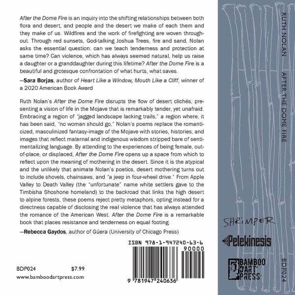 In After the Dome Fire, author Ruth Nolan takes readers on an eco-poetic journey through the wilderness of California's Mojave Desert and Southern California, and the work of firefighting and raising a daughter as a single parent in a rough yet nurturing landscape. The poems also evoke a fierce and beautiful "desert" revealed as a vibrant character with its own agency to survive and regenerate from the devastating impacts of wildfires, and remind us all of the power of our desert environment to inspire and regenerate the human spirit.