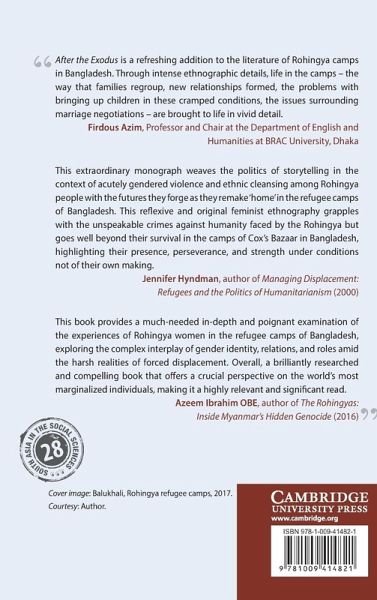 "After the Exodus examines how forced migration of the Rohingya from Myanmar to Bangladesh has affected the gendered subjectivities and lived experiences of Rohingya refugee women, and transformed gender relations and roles in displacement. Based on 14 months of feminist ethnographic fieldwork in Bangladesh's Kutupalong-Balukhali refugee camp in 2017 and 2018, the book uncovers the everyday strategies employed by refugee women to create a sense of belonging and to make a life for themselves after forced migration. Rohingya women adapt to camp life by negotiating marriage and intimate experiences, adjusting to changing gender divisions of labour, and navigating encounters with humanitarian aid agencies and male camp leaders. These women strategically bargain shifting power relations to reconstruct their lives in displacement, thereby reclaiming agency and asserting their identity through the spaces they create, inhabit, and reshape; the coping mechanisms they employ; and the bonds of kinship and community they forge"--