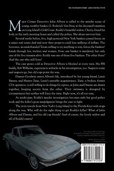 Major Crimes Detective John Albora is called to the murder scene of young, wealthy banker, G. Roderick Von Ness, at the mansion on Long Island's Gold Coast. Roddy's beautiful widow, Cherry, found his body in the early morning hours and called the police. She alone survives him. Several weeks before, five, high-powered New York bankers joined forces on a major real estate deal and now their projects could lose millions of dollars. The borrower, an underhanded Texan willing to try anything to win, forces the bankers' hands through lies, trickery and women. So now, one banker is murdered, but only one of the five remains alive and well. Roddy was one of those five bankers. What happened to the other three? And the one who still lives? The case grows cold as Detective Albora is blocked at every turn. His FBI buddy, Bob Wilhelm, experiences setbacks in his investigation, too. Suspects come and suspects go, but old cops point the way. Dianne Goodwin enters Albora's life, introduced by her young friend, Lanie Barnes, and Hunter Zane, Lanie's unstable acquaintance. Zane, a broken, former CIA operative, is still willing to do things for a price, as John and Dianne are drawn together keeping secrets from the other. Their intimacy is disrupted by circumstances but neither will force the issue. Right now, it's all too easy. As weeks pass, Roddy's murder investigation becomes stale but good police work and the killer's gross misjudgment brings the case to light. The story travels from New York's Long Island to the Florida Keys with stops along the way. Who will do the right thing to get Roddy's killer? What of John Albora and Dianne, and his old cop friends? And of course, the lovely widow and all of Roddy's assets?