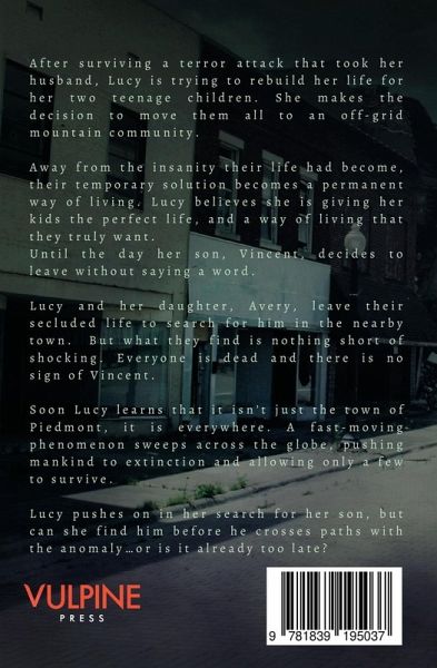 After surviving a terror attack that took her husband, Lucy is trying to rebuild her life for her two teenage children. She makes the decision to move them all to an off-grid mountain community. Away from the insanity their life had become, their temporary solution becomes a permanent way of living. Lucy believes she is giving her kids the perfect life, and a way of living that they truly want. Until the day her son, Vincent, decides to leave without saying a word. Lucy and her daughter, Avery, leave their secluded life to search for him in the nearby town. But what they find is nothing short of shocking. Everyone is dead and there is no sign of Vincent. Soon Lucy learns that it isn't just the town of Piedmont, it is everywhere. A fast-moving phenomenon sweeps across the globe, pushing mankind to extinction and allowing only a few to survive. Lucy pushes on in her search for her son, but can she find him before he crosses paths with the anomaly...or is it already too late?