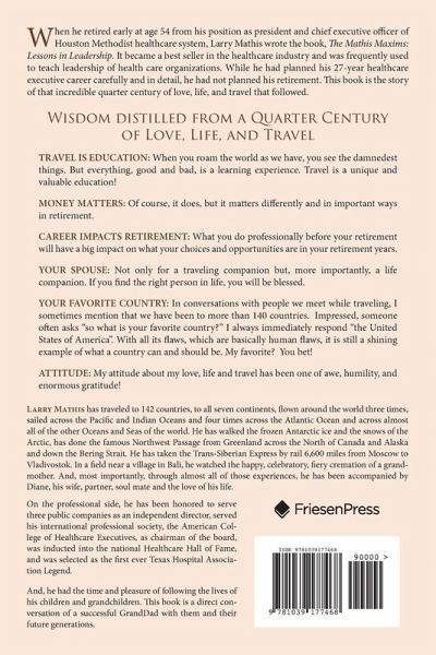 When he retired early at age 54 from his position as president and chief executive officer of Houston Methodist healthcare system, Larry Mathis wrote the book, The Mathis Maxims: Lessons in Leadership. It became a best seller in the healthcare industry and was frequently used to teach leadership of health care organizations. While he had planned his 27-year healthcare executive career carefully and in detail, he had not planned his retirement. This book is the story of that incredible quarter century of love, life, and travel that followed. Wisdom distilled from a Quarter Century of Love, Life, and Travel TRAVEL IS EDUCATION: When you roam the world as we have, you see the damnedest things. But everything, good and bad, is a learning experience. Travel is a unique and valuable education! MONEY MATTERS: Of course, it does, but it matters differently and in important ways in retirement. CAREER IMPACTS RETIREMENT: What you do professionally before your retirement will have a big impact on what your choices and opportunities are in your retirement years. YOUR SPOUSE: Not only for a traveling companion but, more importantly, a life companion. If you find the right person in life, you will be blessed. YOUR FAVORITE COUNTRY: In conversations with people we meet while traveling, I sometimes mention that we have been to more than 140 countries. Impressed, someone often asks "so what is your favorite country?" I always immediately respond "the United States of America." With all its flaws, which are basically human flaws, it is still a shining example of what a country can and should be. My favorite? You bet! ATTITUDE: My attitude about my love, life and travel has been one of awe, humility, and enormous gratitude!