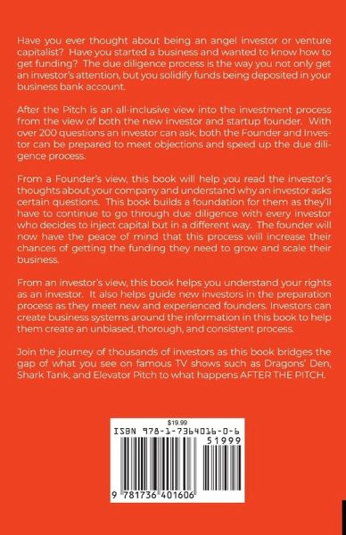 Have you ever thought about being an angel investor or venture capitalist? Have you started a business and wanted to know how to get funding? The due diligence process is the way you not only get an investor's attention, but you solidify funds being deposited in your business bank account. After the Pitch is an all-inclusive view into the investment process from the view of both the new investor and startup founder. With over 200 questions an investor can ask, both the Founder and Investor can be prepared to meet objections and speed up the due diligence process. From a Founder's view, this…mehr