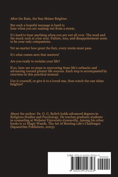 After the Rain, the Sun Shines Brighter. But you have to be able to pry open your eyes and look to the skies. The revised edition of this short, practical self-help manual offers 10 steps for recovery from life's setbacks and progress toward greater life success. Filled with sound counsel and helpful exercises that can be completed inside the books own pages, this is the perfect gift to yourself or anyone else who right now is wet all over from the downpours of life.