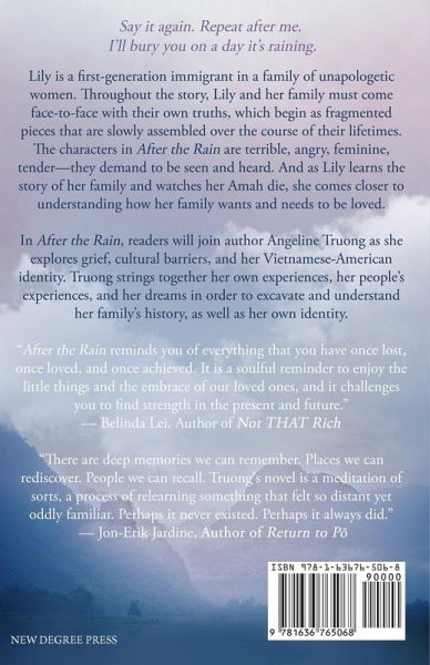 Say it again. Repeat after me. I'll bury you on a day it's raining. Lily is a first-generation immigrant in a family of unapologetic women. Throughout the story, Lily and her family must come face-to-face with their own truths, which begin as fragmented pieces that are slowly assembled over the course of their lifetimes. The characters in After the Rain are terrible, angry, feminine, tender-they demand to be seen and heard. And as Lily learns the story of her family and watches her Amah die, she comes closer to understanding how her family wants and needs to be loved. In After the Rain, readers will join author Angeline Truong as she explores grief, cultural barriers, and her Vietnamese-American identity. Truong strings together her own experiences, her people's experiences, and her dreams in order to excavate and understand her family's history, as well as her own identity.