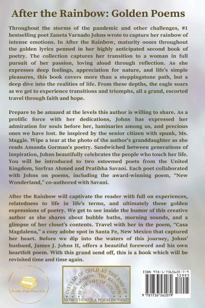 Throughout the storms of the pandemic and other challenges, #1 bestselling poet Zaneta Varnado Johns wrote to capture her rainbow of intense emotions. In After the Rainbow, maturity oozes throughout the golden lyrics penned in her highly anticipated second book of poetry. The collection captures her transition to a woman in full pursuit of her passion, loving aloud through reflection. As she expresses deep feelings, appreciation for nature, and life's simple pleasures, this book covers more than a steppingstone path, but a deep dive into the realities of life. From these depths, the eagle soars as we get to experience transitions and triumphs, all a grand, escorted travel through faith and hope. Prepare to be amazed at the levels this author is willing to share. As a prolific force with her dedications, Johns has expressed her admiration for souls before her, luminaries among us, and precious ones we have lost. Be inspired by the senior citizen with spunk, Ms. Maggie. Wipe a tear at the photo of the author's granddaughter as she reads Amanda Gorman's poetry. Sandwiched between generations of inspiration, Johns beautifully celebrates the people who touch her life. You will be introduced to two esteemed poets from the United Kingdom, Sarfraz Ahmed and Pratibha Savani. Each poet collaborated with Johns on poems, including the award-winning poem, "New Wonderland," co-authored with Savani. After the Rainbow will captivate the reader with full on experiences, relatedness to life in life's terms, and ultimately these golden expressions of poetry. We get to see inside the humor of this creative author as she shares about bubble baths, morning sounds, and a glimpse of her closet's contents. Travel with her in the poem, "Casa Magdalena," a cozy adobe spot in Santa Fe, New Mexico that captured her heart. Before we dip into the waters of this journey, Johns' husband, James J. Johns II, offers a beautiful foreword and his own heartfelt poem. With this grand send off, this is a book which will be revisited time and time again.