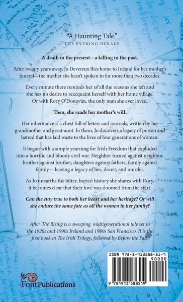 A death in the present-a killing in the past. After twenty years away, Jo Devereux flies home to Ireland for her mother's funeral - the mother she hasn't spoken to for more than two decades. Every minute there reminds her of all the reasons she left and she has no desire to reacquaint herself with her home village. Or with Rory O'Donovan, her lost love. Then, she reads her mother's will. Her inheritance is a chest full of letters and journals, written by her grandmother and great-aunt, that answer a long held secret. Who murdered her great-uncle in the Irish Civil War.. and why? How did what an uprising for Irish freedom and independence degenerate into a bitter civil war where neighbor turned against neighbor, and family against family- leaving a legacy of lies, secrets, and silences for generations to come? As Jo unearths the bitter, buried history she shares with Rory she finally understands why their love was doomed from the start. But what about now? Can she stay true to both her heart and her heritage? She knows from her own life how the wild energy of rebellion can carry someone away... but what happens after the rising?