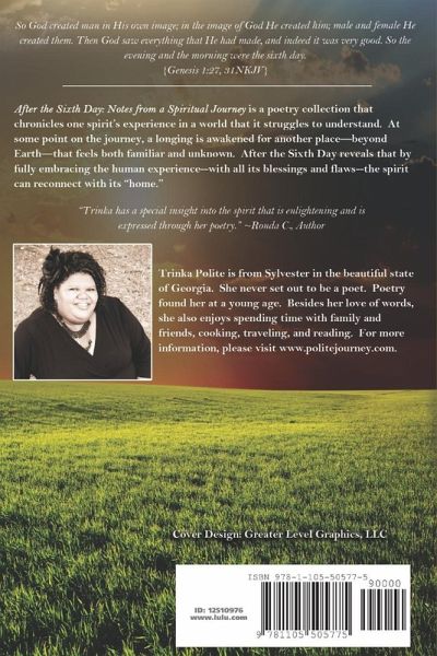 After the Sixth Day tells the story of one spirit living in a world that it's trying to understand. At some point on the journey, a longing is awakened for another world that feels both familiar and unknown. This story is uniquely told through poetry and prose with sincere and powerful emotion. Trinka's "notes" reveal what we all soon realize; through interaction with the world, the spirit is tested, awakened and strengthened. ~~~~ So God created man in His own image; in the image of God He created him; male and female He created them. Then God saw everything that He had made, and indeed it was very good. So the evening and the morning were the sixth day. {Genesis 1:27,31 NKJV}