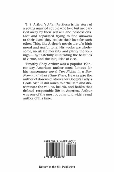 T. S. Arthur's After the Storm is the story of a young married couple who love but are carried away by their self will and possessions. Lost and separated trying to find answers to their lives, they realize their love for each other. This, like Arthur's novels are of a high moral and useful tone. His works are wholesome, inculcate morality and purify the feelings - by tastefully illustrating the beauties of virtue, and the iniquities of vice. Timothy Shay Arthur was a popular 19th-century American author most famous for his temperance novel Ten Nights in a Bar-Room and What I Saw There. He was also the author of dozens of stories for Godey's Lady's Book. Arthur did much to articulate and disseminate the values, beliefs, and habits that defined respectable life in America. Arthur was one of the most popular and widely read author of his time.