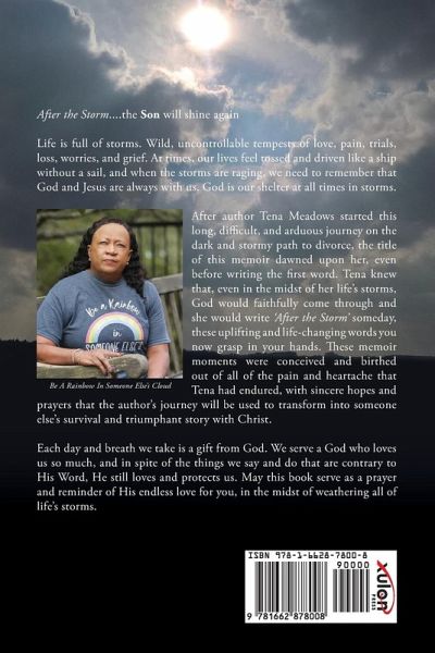 After the Storm....the Son will shine again Life is full of storms. Wild, uncontrollable tempests of love, pain, trials, loss, worries, and grief. At times, our lives feel tossed and driven like a ship without a sail, and when the storms are raging, we need to remember that God and Jesus are always with us. God is our shelter at all times in storms. After author Tena Meadows started this long, difficult, and arduous journey on the dark and stormy path to divorce, the title of this memoir dawned upon her, even before writing the first word. Tena knew that, even in the midst of her life's storms, God would faithfully come through and she would write 'After the Storm' someday, these uplifting and life-changing words you now grasp in your hands. These memoir moments were conceived and birthed out of all of the pain and heartache that Tena had endured, with sincere hopes and prayers that the author's journey will be used to transform into someone else's survival and triumphant story with Christ. Each day and breath we take is a gift from God. We serve a God who loves us so much, and in spite of the things we say and do that are contrary to His Word, He still loves and protects us. May this book serve as a prayer and reminder of His endless love for you, in the midst of weathering all of life's storms.