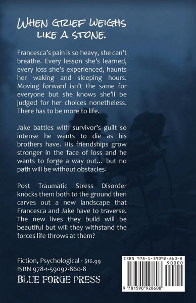 When grief weighs like a stone. Francesca's pain is so heavy, she can't breathe. Every lesson she's learned, every loss she's experienced, haunts her waking and sleeping hours. Moving forward isn't the same for everyone but she knows she'll be judged for her choices nonetheless. There has to be more to life. Jake battles with survivor's guilt so intense he wants to die as his brothers have. His friendships grow stronger in the face of loss and he wants to forge a way out... but no path will be without obstacles. Post Traumatic Stress Disorder knocks them both to the ground then carves out a new landscape that Francesca and Jake have to traverse. The new lives they build will be beautiful but will they withstand the forces life throws at them?