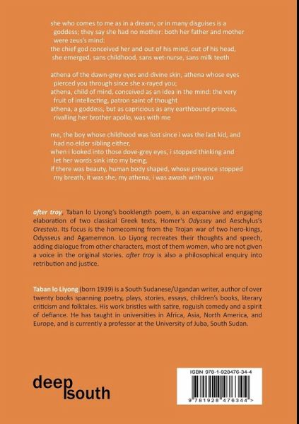 after troy, Taban lo Liyong's booklength poem, is an expansive and engaging elaboration of two classical Greek texts, Homer's Odyssey and Aeschylus's Oresteia. Its focus is the homecoming from the Trojan war of two hero-kings, Odysseus and Agamemnon. Lo Liyong recreates their thoughts and speech, adding dialogue from other characters, most of them women, who are not given a voice in the original stories. after troy is also a philosophical enquiry into retribution and justice.